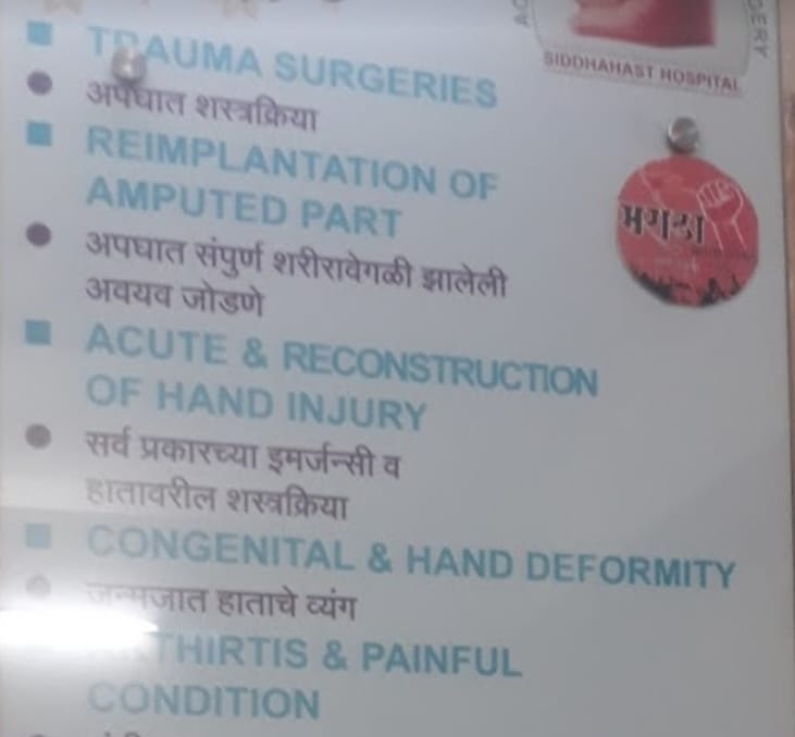 Dr. Siddharth Patil MS Ortho, TRAUMA SURGERIES , REIMPLANTATION OF AMPUTED PART, ACUTE & RECONSTRUCTION OF HAND INJURY , CONGENITAL & HAND DEFORMITY THIRTIS & PAINFUL CONDITION , NERVE INJURY / PARALYIC CONDITION , SKIN COVERAGE FOR WOUNDS WITH FREE FLAP, ROTATION FLAP & OTHER FLAP TINGLING/ NUMBNESS, POST BURN CONRTACTURE CRUSH INJURY OF HANDS & LOWER LIMBS , DIABETIC FOOR / BURNING SOLE V